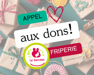 Chaque année, Le Berceau remet environ 75 sacs de vêtements et de petites douceurs aux familles dans le besoin, en collaboration avec le Grain de Sel, le CLSC et la Maison de la Famille. Cette année, notre friperie est presque vide et nous avons besoin de votre aide pour poursuivre cette belle tradition.
